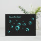A classy simple minimalist design featuring a group of pretty blue shiny bubbles contrasted against a deep black background with the phrase: Save the Date in matching aqua blue. The back is a light ocean blue with text template that you change to your own details or you can delete the text and hand write your message on the back. Buy in bulk and save.