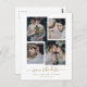 This simple yet ultra modern wedding save the date postcard features four of your favorite personal photos in a unique, layered look photo grid. The faux gold and white card design features elegant, trendy handwritten script typography, and has a spot for your wedding information in a coordinating sans serif font.
