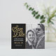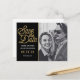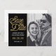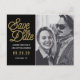 Nontraditional Save the Date Wedding postcard has a modern gold script against a black background. Your black and white photo is complimented with this bold announcement.
