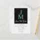 Announce your wedding date with this elegant teal monogram on white and black marble Save The Date Postcard. All items are customizable: date, names, city and state. Has return address on back. Send to relatives and friends.