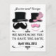 Featured on the graphic design are a black mustache, pink mustache, black top hat, pink top hat that includes a flower and feathers. Also includes a pearl necklace. Text reads " We Mustache You To Save The Date". Great for a mustache bash, wedding, anniversary, rehearsal, fundraiser, shower or any special event.