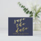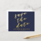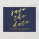 NewParkLane - Elegant Postcard, with 'Save the date' in elegant faux gold foil script typography, against a navy blue background. Easy to customize in Zazzle with your own names, date or other text for a personalized design. All text style, colors, sizes can be modified to fit your needs. You can also change the background color to any color you prefer.