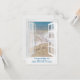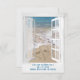 Save The Date with names of couple in beach hearts in sand with frothy ocean surf and open window view.
