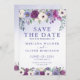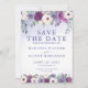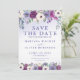 Periwinkle, fuchsia, and blush watercolor floral save the date announcement, with a very light peri wash textured background. Customize names, dates, and information.