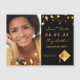 On front: Add your own vertical size photo of the graduate. A chic black background color, decorated with faux gold stars. Personalize and add a name and date. Golden letters. The name and the text: Save the Date are written with a modern hand lettered style script.
