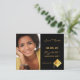 On front: Add your own vertical size photo of the graduate. A chic black background color. Templates for a name and date. Golden letters. The name and the text: Save the Date are written with a modern hand lettered style script.