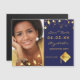 On front: Add your own vertical size photo of the graduate. A chic navy blue background color, decorated with faux gold stars. Personalize and add a name and date. Golden letters. The name and the text: Save the Date are written with a modern hand lettered style script.