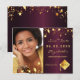 On front: Add your own vertical size photo of the graduate. A deep burgundy faux metallic looking background color, decorated with faux gold stars. Personalize and add a name and date. Golden letters. The name and the text: Save the Date are written with a modern hand lettered style script.
