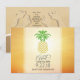 Personalize pineapple hearts are everywhere save the date cards overlaying tropical sunset.