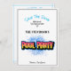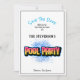 A family pool party or birthday pool party that you can personalize using the "personalize this template" feature on the right. Cool blue and black typography on a white background with a blue splash graphic. All the details can be entered on the back.