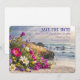Beautiful flower son a coastal setting. A white sandy beach, with the rugged shoreline and ocean. A pretty save the date card.