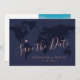 Navy Blue and Rose Gold Blush Pink and copper color world map save the date card for a destination wedding with a moveable heart location marker and your engagement photo alongside cute and elegant modern typography that's pretty and minimalist. Perfect for tropical, beach, island, city, mountain and adventure destination wedding locations all over the world. Click CUSTOMIZE FURTHER to move the heart, change the background and text color, change fonts. Check our designer shop for coordinating items!