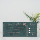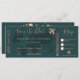 A modern and cool Save the date script world map plane boarding pass in in faux rose gold foil and editable emerald green, perfect for destination weddings.
