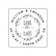 This stamp is an excellent choice for any couple looking for a personal touch to their wedding-related mail. This design features your names, wedding date and wedding location in a circle around the outside of the stamp with a frame of rustic, hand-drawn leaves inside surrounding some rustic typography that reads "save the date" in a blend of rustic script and all-caps lettering. Click the "personalize" button at the top to add your own details and then be sure to check the best size for your needs!