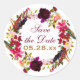 This beautiful burgundy watercolor florals and feathers wedding save the date sticker or envelope seal features burgundy, crimson, aubergine, and cream roses or peony type flowers with greenery leaves and branches in shades of olive green, rust, burnt orange, and brown, along with assorted colorful feathers in orange, purple, gray, and black. The customizable wording is in a gold and burgundy color palette.