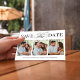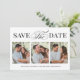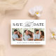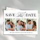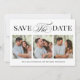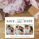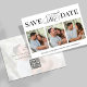 This design features save the date photo card, perfect for weddings, with a modern minimalist style, with a simple black and white, elegant, typography, calligraphy script design, a four photo collage template, a classy classic design.