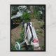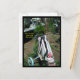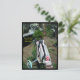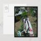 A pink & blue golf cart full of red & pink flowers a nice save the date wedding postcard