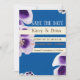 Elegant, modern blue and white Save the date invitation. Beautiful purple and white flowers with sense of summer.