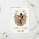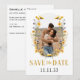 This "Save the Date" card features your photograph, surrounded by a floral wreath made up of yellow, white, and purple flowers, creating a warm and inviting feel. Below the image, the text "SAVE THE DATE" is displayed in gold, bold font, adding a touch of sophistication. The date is prominently centered at the bottom in a clean, black serif font. The overall design balances a modern and rustic aesthetic, perfect for a nature-loving couple.