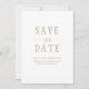 Save the Date White Gold Invitation. Elegant modern typography design. Antique gold colored text on white with the back featuring an original mixed media antique gold modern abstract artwork print. Personalise with your own text. A beautiful save the date design excellent for weddings, engagements, anniversaries, and other special occasions.