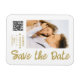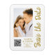 Save The Date White Gold Stylish Script Modern Wedding Magnets features a white background with your custom photo. Personalize with your text by editing the text in the text boxes provided and add your website URL for your custom QR code. Designed for you by ©Evco Studio www.zazzle.com/store/evcostudio