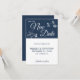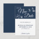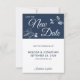 Elegant and romantic floral Save The New Date wedding postponement card, featuring a beautiful and delicate white orchids line drawing design at the top, over a classy Prussian blue background. The lower part is easily personalizable by editing the template fields with your names, date, and location in a modern and simple dark blue all-caps font over a simple white background.