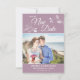 Elegant and romantic Save The New Date - wedding postponement photo card, featuring a beautiful and delicate white orchids floral line drawing on the upper part, over a classy dusty purple background. Easily personalizable by adding one of your favorite engagement horizontal pictures, and by editing the template fields on the purple lower band with your names, date, and location in a modern and simple white all-caps font.