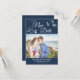 Elegant and romantic Save The New Date - wedding postponement photo card, featuring a beautiful and delicate white orchids floral line drawing on the upper part, over a classy Prussian blue background. Easily personalizable by adding one of your favorite engagement horizontal pictures, and by editing the template fields on the dark blue lower band with your names, date, and location in a modern and simple white all-caps font.