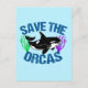 Save the Orcas featuring a cool killer whale and midnight blue text for a marine animal lover. Pretty green and purple coral decorate the sides of this ocean design. Blackfish should be protected.