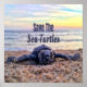 Save The Sea Turtles, cute little baby sea turtle in the sandy beach with the waves behind.