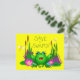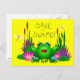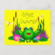 Save the Swamp postcard, Beulah the Frog (a true femme fatale of the frog world) with pink lilies, dragonflies, cattails and marsh foliage, cheerful yellow background. Wetlands are abundant with diverse wildlife and colorful flora, and are a vital source of natural resources. A portion of proceeds from every "Save the Swamp!" product sold goes toward environmental awareness and wetland conservation. Save the swamp and share the joy!