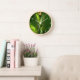 A fallen leaf, dry and brown, rests on a saw palmetto frond in the woods. The original photograph by ZoeSPEAK on this Wall Clock shows the accordion-like pattern of the palm frond, which opens like a natural fan. The shades of yellow green look beautiful in the sunlight and shadows.