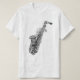 A cool, detailed design of a saxophone on a white t-shirt, with fingerprints and added musical notes.