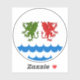 "Argent, two dragons addorsed, the dexter vert and the sinister gules, a base engrailed barry azure and argent."