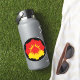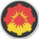 "Per chevron gules and or, a sun counterchanged within a bordure embattled sable."