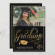 Modern elegant law school graduation announcement and invitation features gold icon of scale of justice on a black background and a photo of the graduate. Personalize with your details and graduation party details on the back.