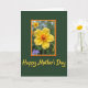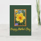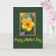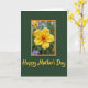 This card features a sunlit yellow flower centered like a small token of affection, its rounded petals opening around a fiery orange-red center that feels warm and inviting ❤️. The bloom sits inside a scallop-edged frame in deep orange with a thinner inner outline in bright yellow, giving it a cozy, vintage garden look. Behind the flower, the framed area fades into a soft blur of greens with hints of other blossoms, like a quiet moment shared side by side in a backyard. Outside the frame, a rich dark green background makes the yellow petals stand out and adds a calm, steady tone. Near the bottom, the words “Happy Mother’s Day” are placed below the framed flower in flowing golden-yellow lettering, gently echoing the flower’s color. The overall layout feels like a friendly hug in paper form, with the glowing center and warm border suggesting closeness and care 🌼. The orange scalloped border sits above the golden-yellow text, all set against the deep green field.
