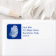 Labels in a block print pattern, based on a scallop shell, in white on a cobalt / navy blue background