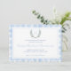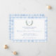 A classic blue gingham watercolor with a laurel crest for initial monogram birth announcement with photo on back