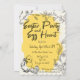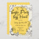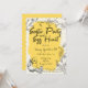 Chic scalloped easter party and egg hunt invitation in yellow tones with a chick wearing a bow, easter eggs, and floral accent hand-drawn style illustrations. Personalize it with your party details and RSVP information.