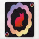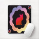 This design was made using Photoshop. The backround is a black frame with a cutout that shows a rainbow of colors. A black circle with a scalloped edge shows a cat designed with a red tint. This mouse pad comes so you can customize.