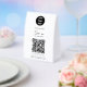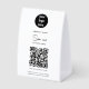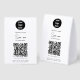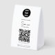 A modern business paper table tent sign design showcasing your business logo, business qr code, business website and social media handle as well as contactless menu or ordering option. A minimalist personalized scan to pay QR code, business logo and social media business table tent signs. A simple and professional way to allow your customers to scan, pay, view menus, price lists etc. Customize the text and make it your own..
