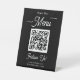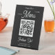 Simple text with business guest option. Qr code for food or service menu with website or social media connection. Like share subscribe