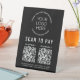 Simple black table top pedestal sign for your business featuring 2 QR codes for customers to scan for payments, enabling you to receive payments anytime, anywhere. Upload your logo and and QR codes, and add your business name, phone number and street address or other information in simple white typography.
