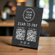 Make checkout fast, simple, and contactless with this modern black Scan to Pay tabletop pedestal sign. Designed for countertops, checkout stations, and vendor tables, this sign lets customers instantly pay with a quick QR code scan. The minimalist layout keeps your branding front and center, featuring your business logo at the top and 2 QR codes. Perfect for small businesses, retail counters, salons, cafés, pop-ups, food trucks, artists, and service providers, this sturdy pedestal sign stands upright for high visibility while taking up minimal space. Add your Facebook, Instagram and TikTok social media handle to encourage ongoing engagement beyond the point of sale.