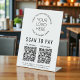 Simple table top pedestal sign for your business with 2 QR codes for contactless mobile payment apps. Add your business logo, and payment apps QR codes, business name, phone number and street address in simple typography.
