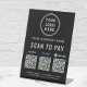 Simple modern black table top pedestal sign for your business. Input your URL website links to Venmo, Paypal and CashApp to create QR codes for customers to scan for payments. Add your logo and business name, phone number and street address in simple white typography.