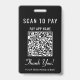 Get paid anywhere you do business with this clean, professional black Scan to Pay QR Code Badge. This lightweight badge lets customers send payment instantly with a quick scan -- perfect for mobile service, busy events, and on-the-go checkout. The minimalist layout features a bold call-to-action, a clearly centered QR code, a friendly “Thank You” message and modern white lettering. Upload your QR code, and add your payment app name and business name for a polished, branded look. Ideal for vendors, artists, bartenders, hair stylists, makeup artists, delivery drivers, market sellers, and event staff, this wearable payment badge keeps checkout fast, contactless, and convenient -- no counter space needed.