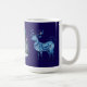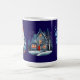 A Blue Scandinavian Christmas Mug With Santa, A House And Reindeer Design In Folk Art Style