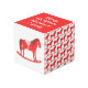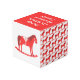 This awesome Christmas photo cube features a digital art image of a cute Scandinavian style rocking horse. The horse is red with a dark red mane, tail and hooves. The friendly horse is smiling. It has a white saddle and reins with pretty red Scandi folk style patterns on the saddle including the sun, moon and stars and hearts and flowers. The base of the rocking horse is red and is covered in pretty white leaves. The design was inspired by the Swedish Dala horse. There is custom text so you can personalize this design with your family name and a message.